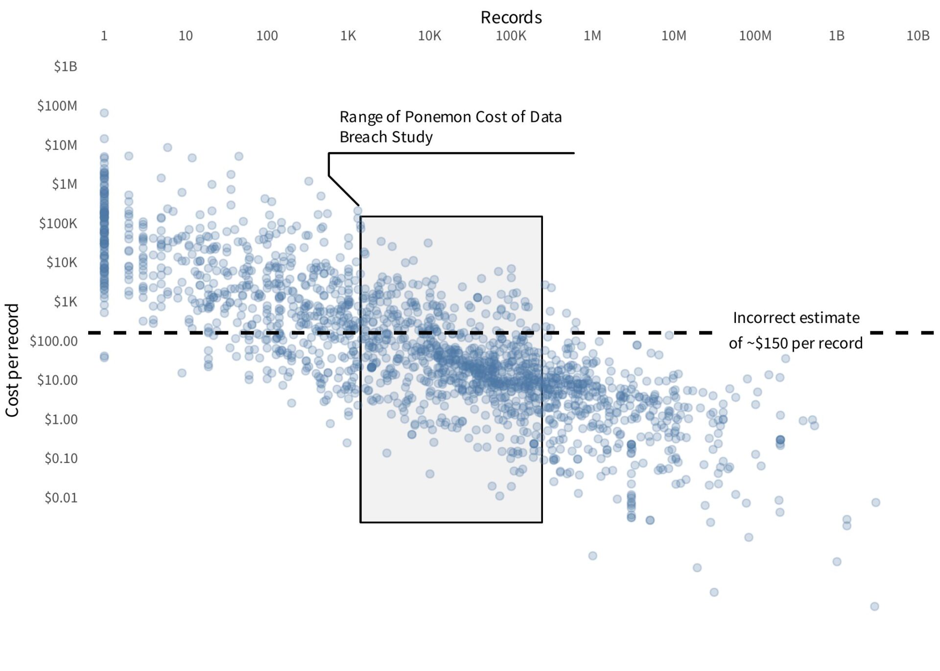 The shaded region indicates the range of events to which the 2025 Ponemon Cost of a Data Breach Study “average cost per record” metric can be applied. The dashed line represents the single “average cost per record” estimate. (Note that the 2025 report appears to have reported the average cost per record only by record type, not overall, but any value in the range they reported would be visually indistinguishable on the log scale used here.)