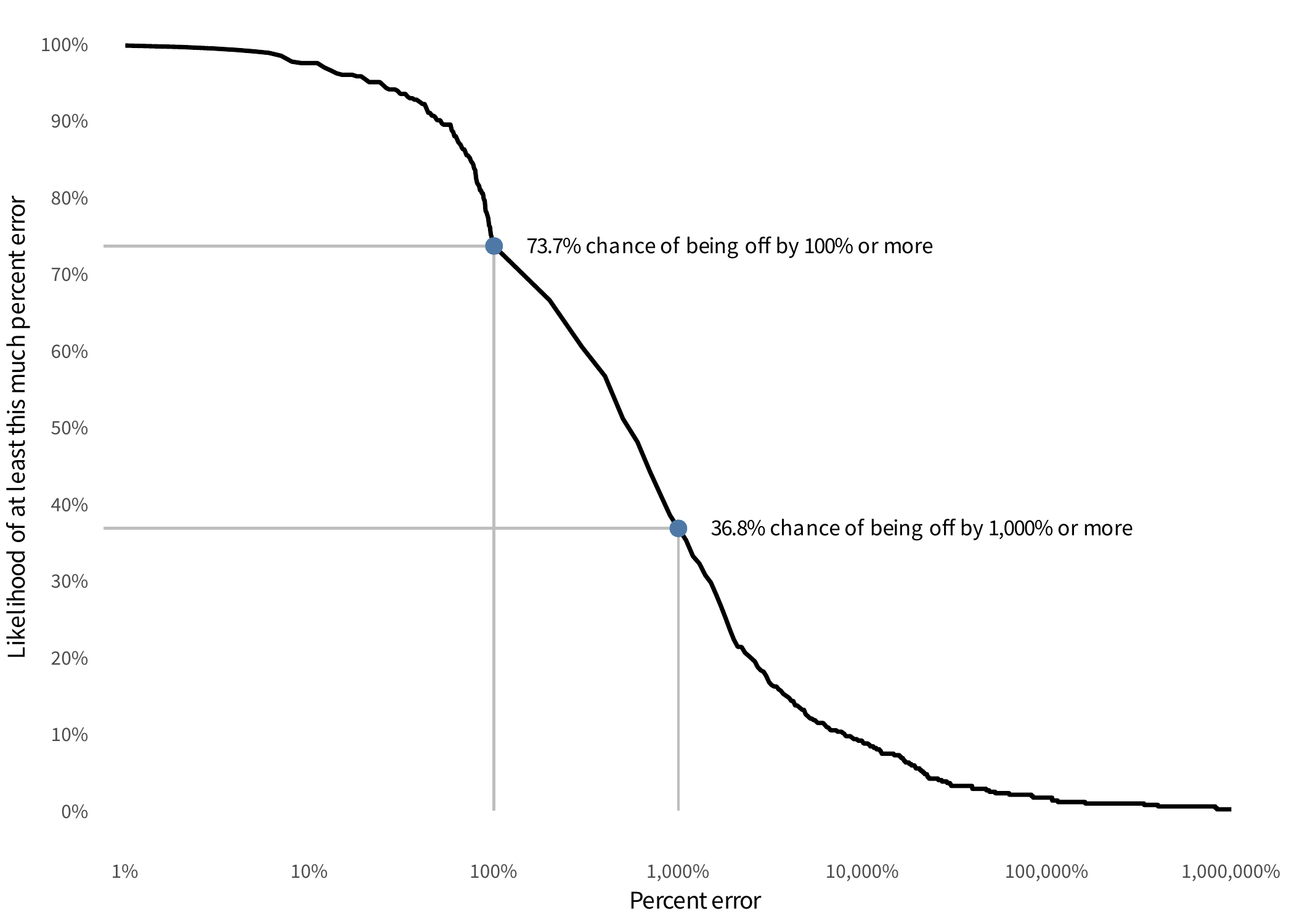 To clarify just how misleading this single average cost per record value is, let’s focus in on only those incidents in the shaded region. If we use the single average cost per record to estimate the total losses for just those events, we can calculate the probability of an error of different magnitudes. This is displayed in the following figure.